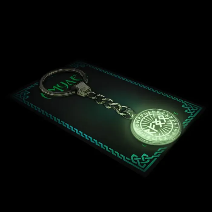Светящийся в темноте брелок-амулет из бижутерного сплава с покрытием под оружейную сталь, защищённый выпуклой стеклянной линзой.