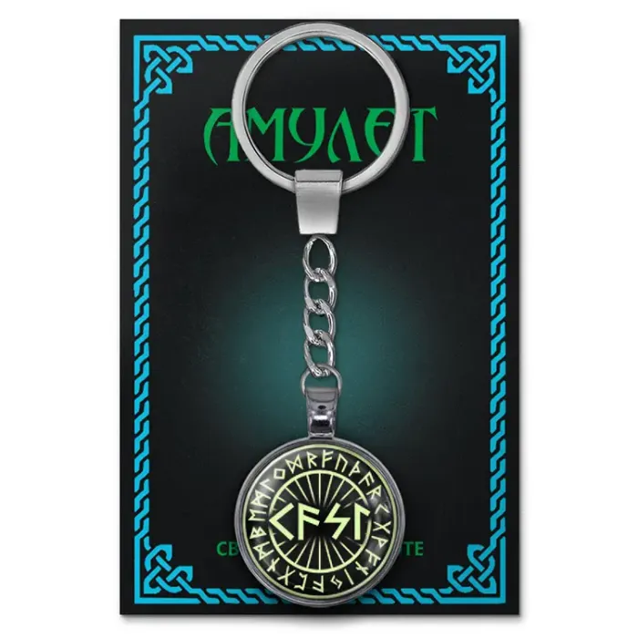 Брелок-амулет из бижутерного сплава со светящимся элементом и изображением рунической формулы.
