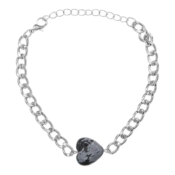 Браслет-цепь из нержавеющей стали с подвеской в форме сердца из натурального снежного обсидиана.