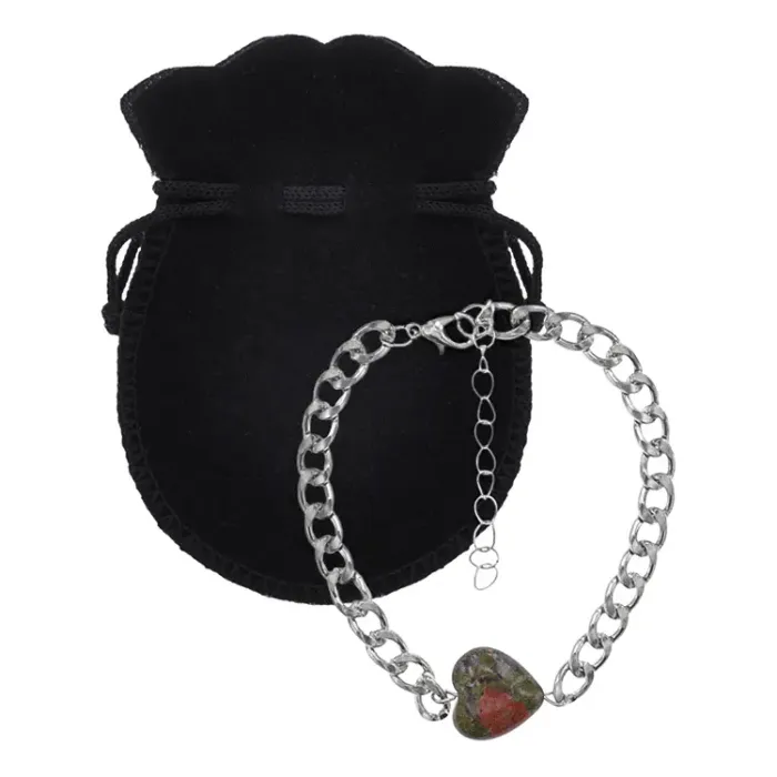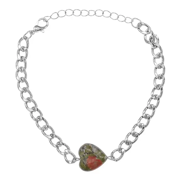 Браслет-цепь из нержавеющей стали с подвеской в форме сердца из натурального камня унакит.