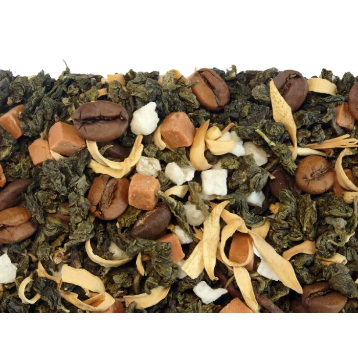 Состав: Улун рассыпной листовой крупный, кусочки карамели, ароматизаторы, цукаты лимона, кофейные зёрна, лепестки апельсина
