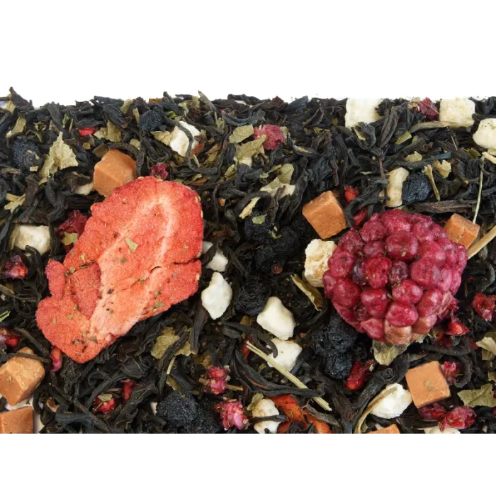Купаж индийского и цейлонского черного чая создаёт насыщенную основу для яркого ягодно-фруктового букета. Напиток раскрывается нотами малины, клубники и листьев чёрной смородины, с кисло-сладким акцентом ежевики и черники, завершёнными оттенками карамели и цитрусовых цукатов.