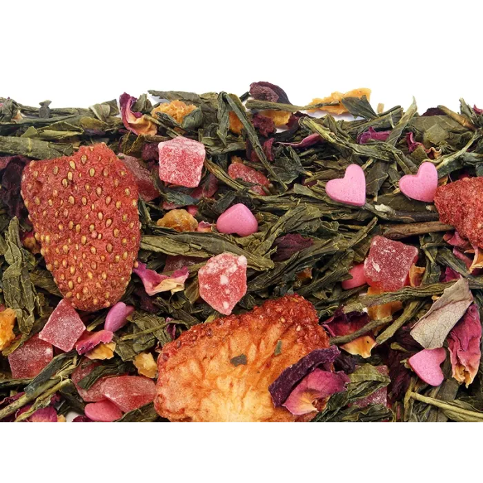 Состав: Чай зелёный рассыпной листовой крупный, кусочки абрикоса, цукаты ананаса, клубника сушёная, лепестки розы красной, кусочки свёклы, кондитерская посыпка (сахар), ароматизаторы «персик», «клубника» (идентичные натуральным).