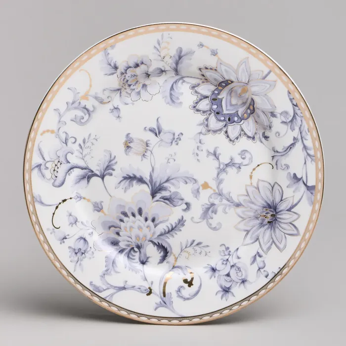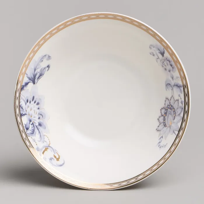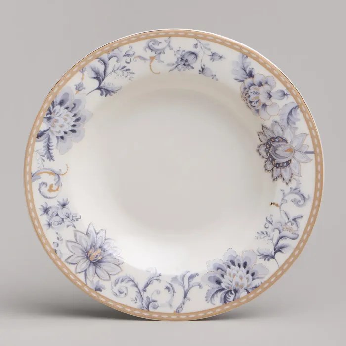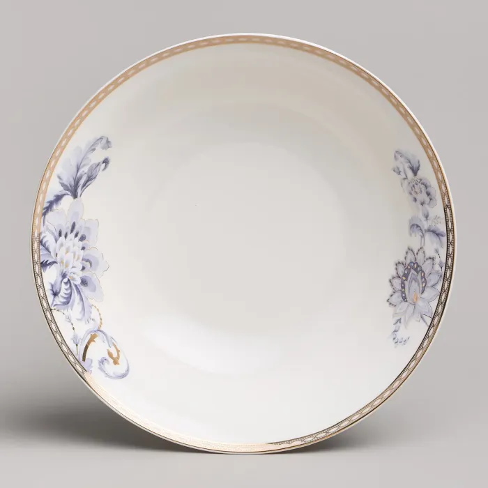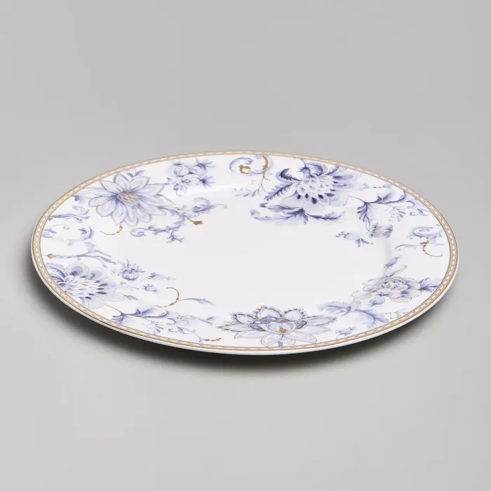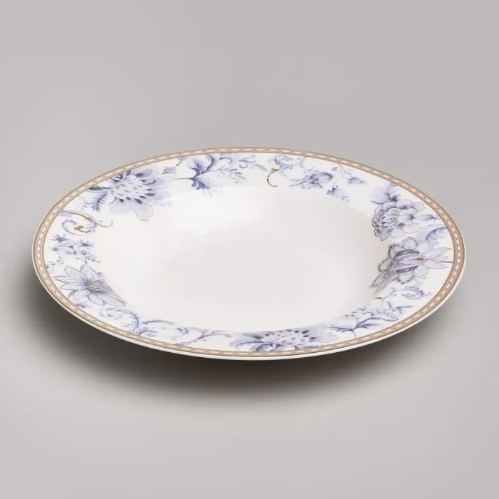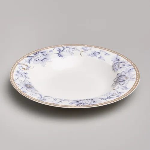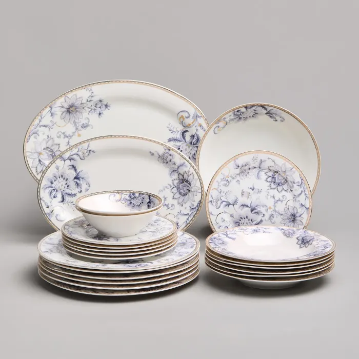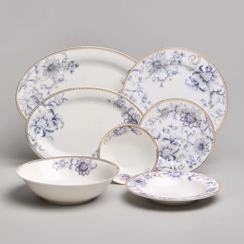 Набор изготовлен из фарфора, материала, отличающегося прочностью и гигиеничностью. В комплект входят тарелки разных размеров, супницы и салатники. Цветочный узор нанесён на поверхность изделий.