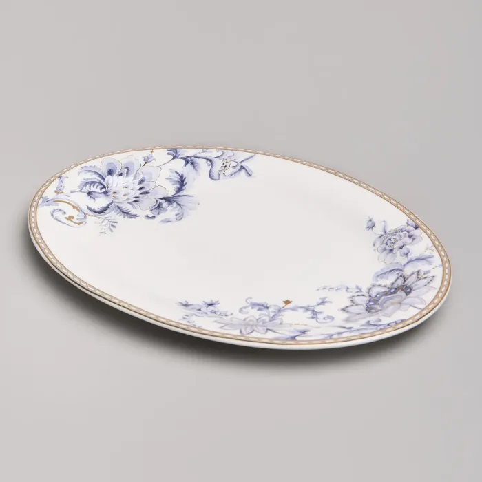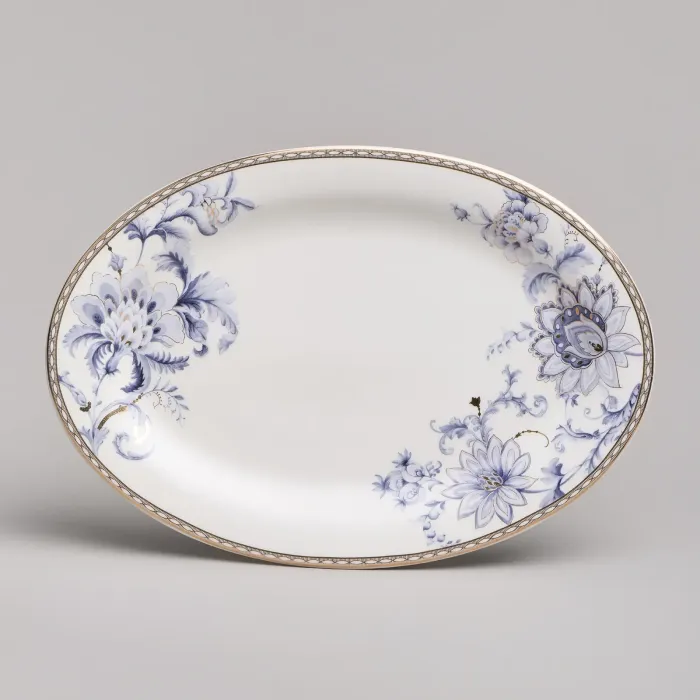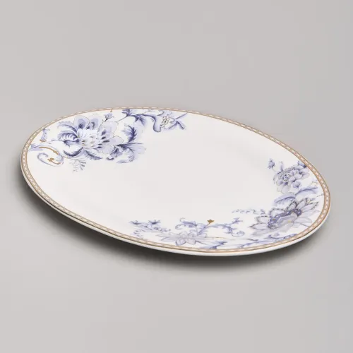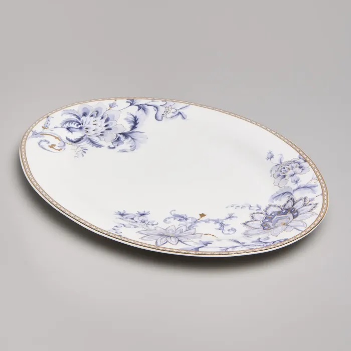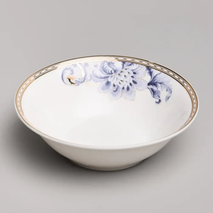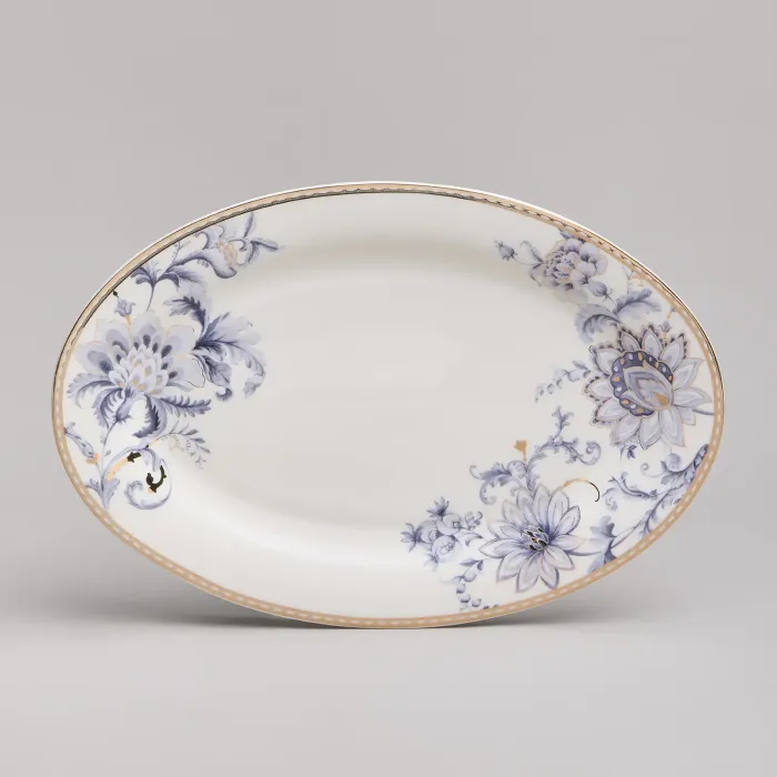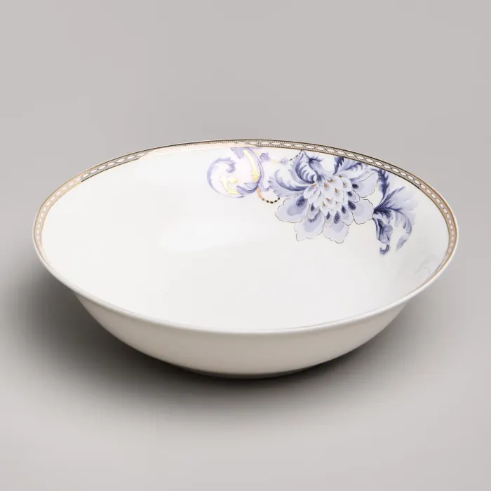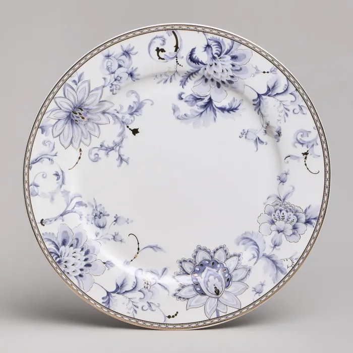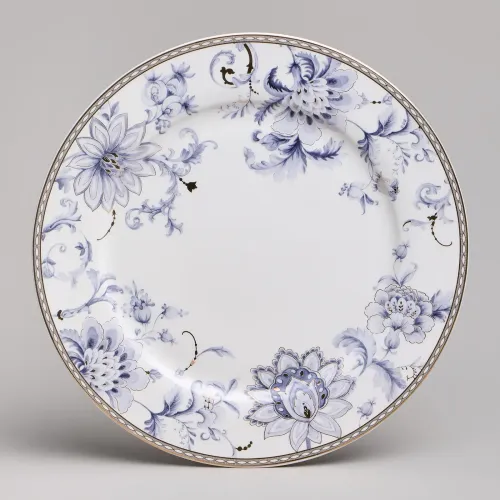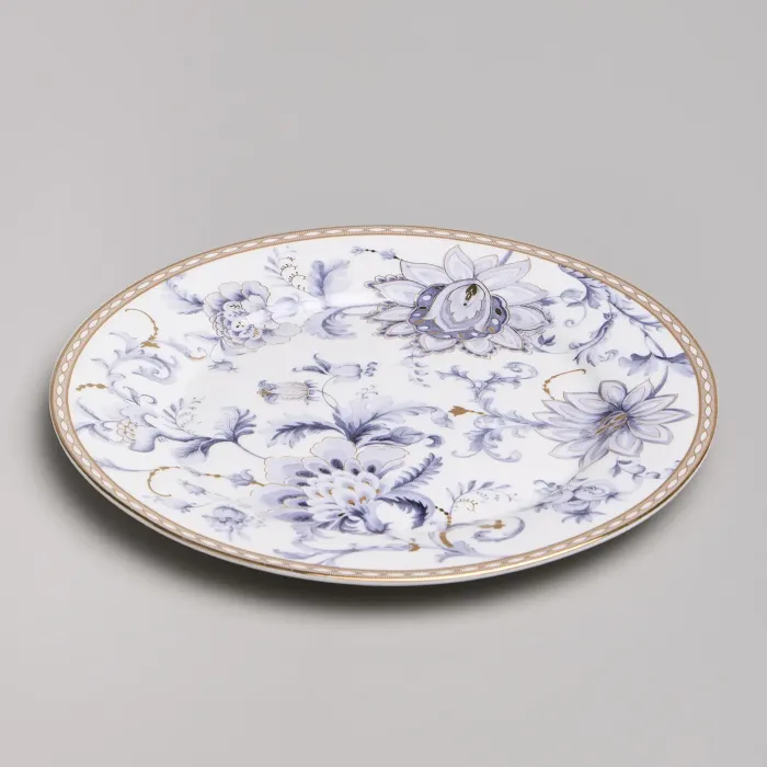 Набор изготовлен из фарфора, материала, отличающегося прочностью и гигиеничностью. В комплект входят тарелки разных размеров, супницы и салатники. Цветочный узор нанесён на поверхность изделий.