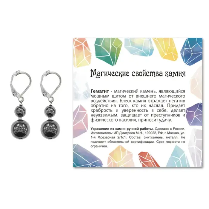 Материал и изготовление: Синтетический камень гематит, бижутерный сплав с покрытием под серебро.