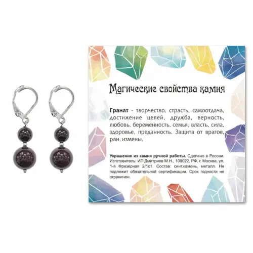 Материал и изготовление: Натуральный гранат, фурнитура из бижутерного сплава с покрытием под серебро.