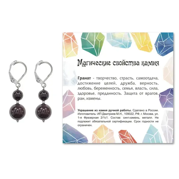 Размеры и комплектация: Длина серьги с швензой — 40 мм, диаметр бусин — 6 мм и 10 мм. Упаковка — прозрачный пакет с подвесом и вкладышем.