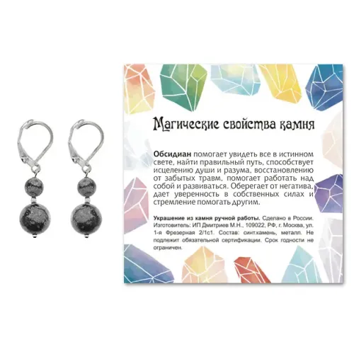 Материал и изготовление: Натуральный снежный обсидиан, фурнитура из бижутерного сплава с покрытием под серебро.