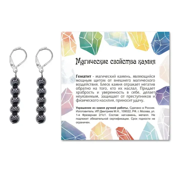 Материал и изготовление: Синтетический камень гематит, ручная работа. Фурнитура из бижутерного сплава с покрытием под серебро.