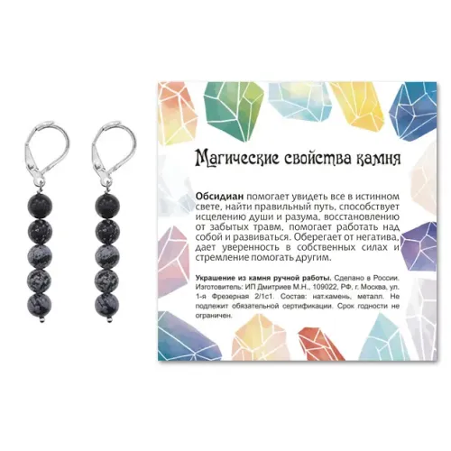 Материал и изготовление: Натуральный камень обсидиан снежный, фурнитура из бижутерного сплава с покрытием под серебро.