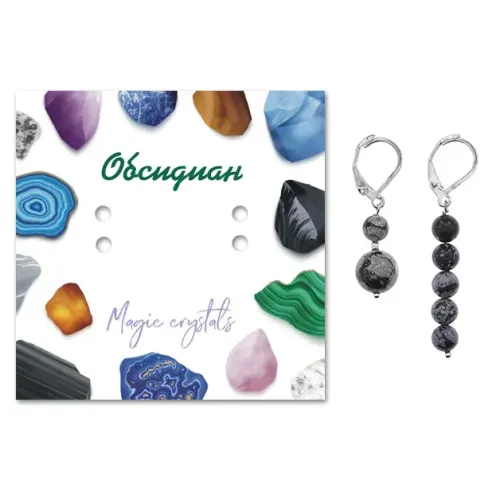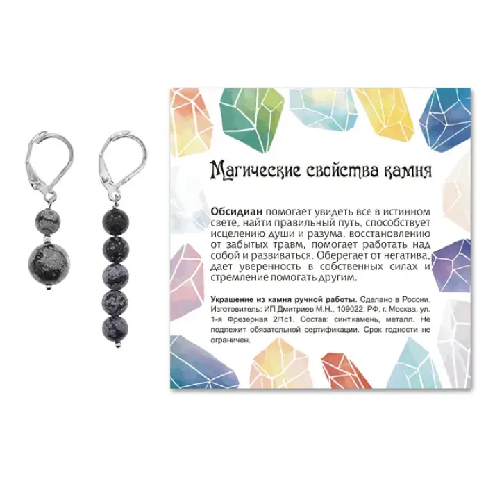 Материал и изготовление: Натуральный снежный обсидиан, фурнитура из бижутерного сплава с покрытием под серебро.