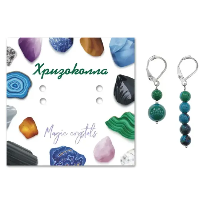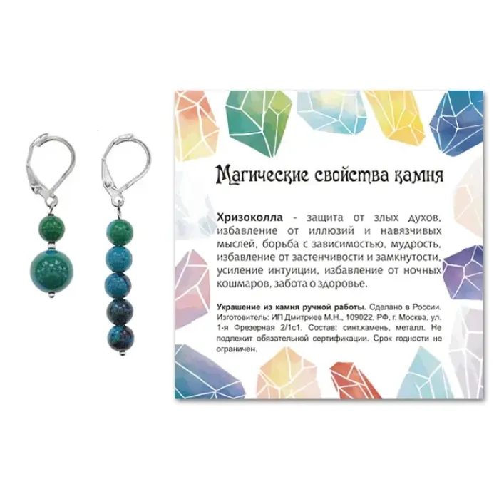 Материал и изготовление: Синтетический камень хризоколла, фурнитура из бижутерного сплава с покрытием под серебро.