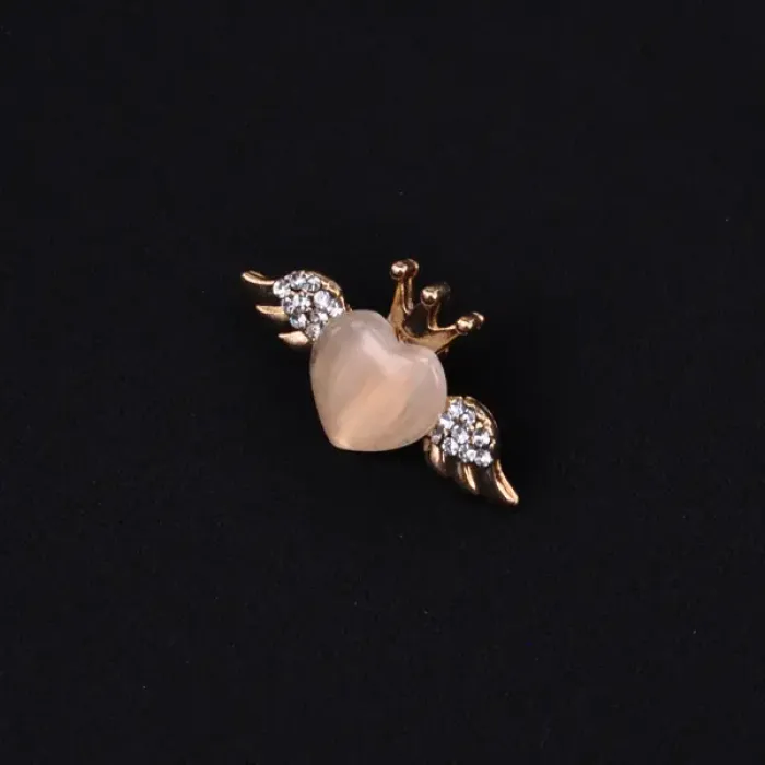Брошь в форме сердца с элементами короны и крыльев. Материал — бижутерный сплав с покрытием под золото и вставками из кошачьего глаза и страз.