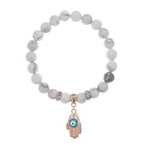 Стрейч-браслет для ношения на запястье из натурального камня кахолонг с подвеской в виде ладони.