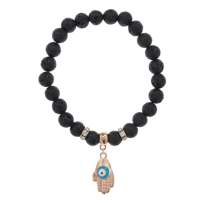 Стрейч-браслет из натурального камня лавы с подвеской в виде ладони и фурнитурой светлого золота.