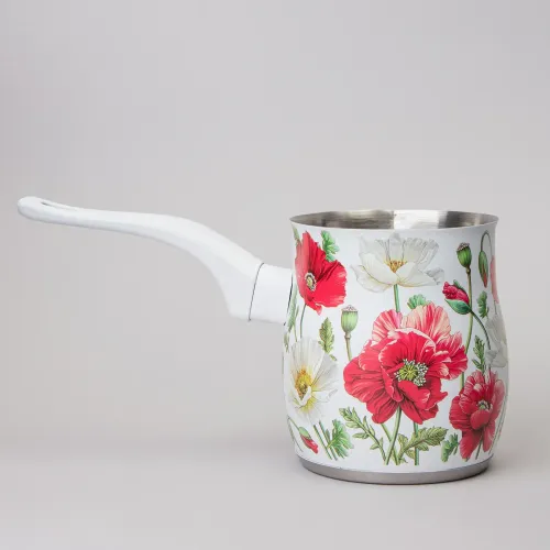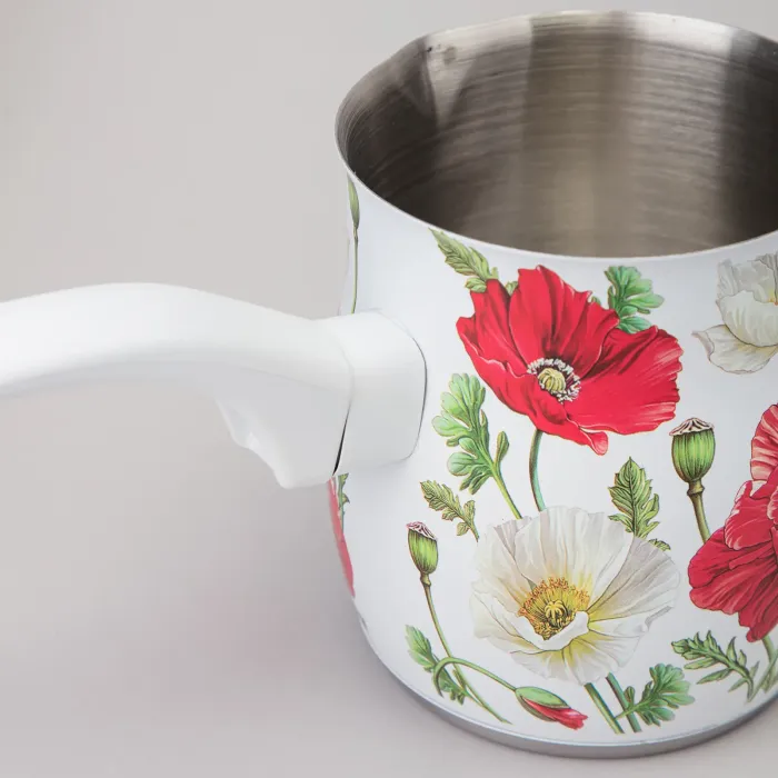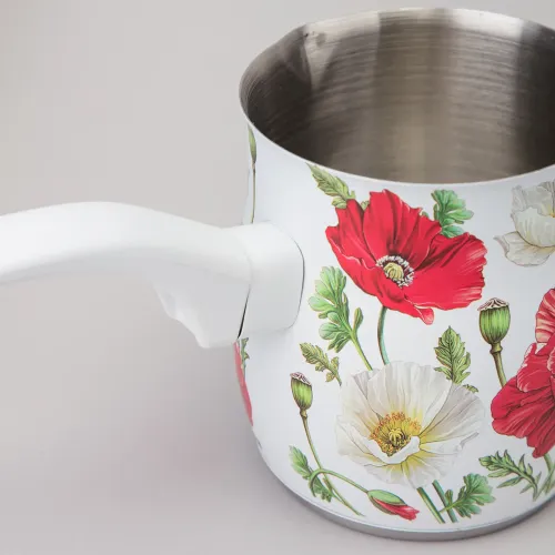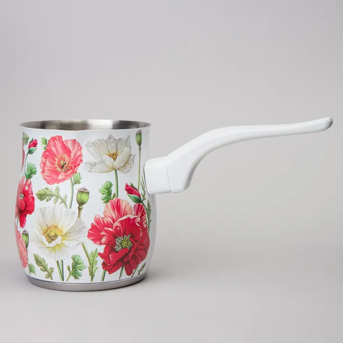 Турка Белые маки идеально подходит для использования на разных типах плит при условии соответствия диаметра конфорок. Эксклюзивное покрытие добавляет эстетическую ценность, делая изделие привлекательным элементом интерьера кухни.
