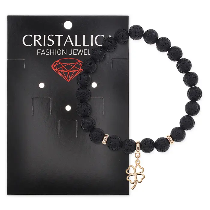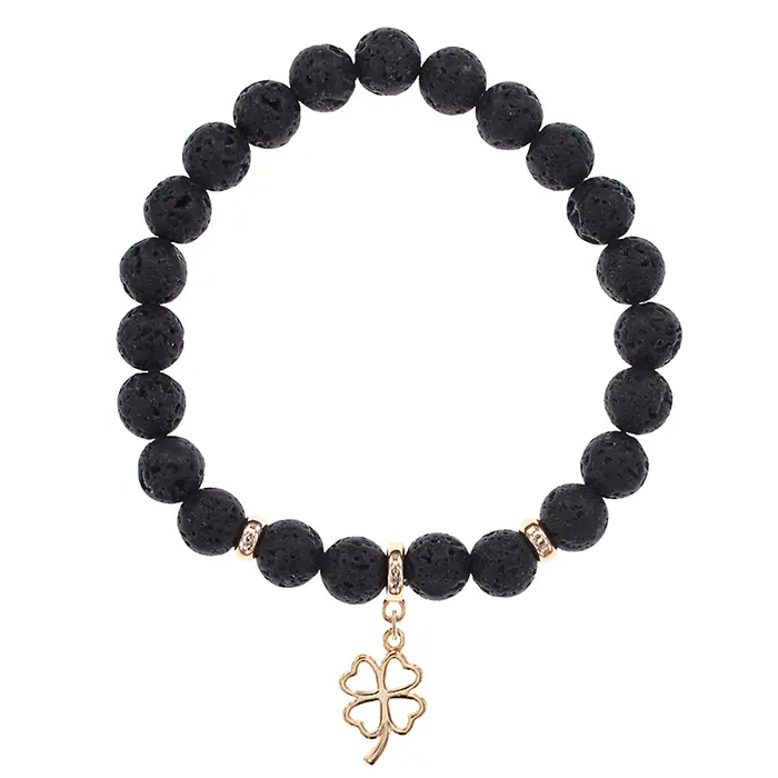 Стрейч-браслет из натурального камня лавы с подвеской в виде клевера.