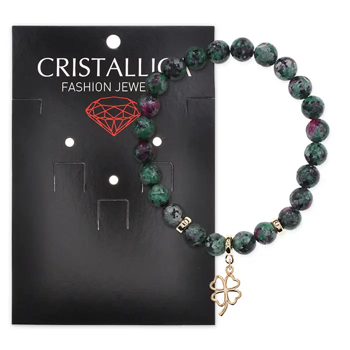 Стрейч-браслет из коллекции Cristallica с бусинами из натурального цоизита и символикой клевера.