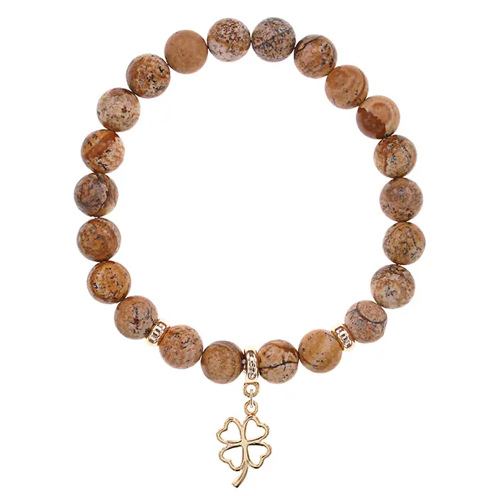 Браслет из натуральной песочной яшмы с бусинами диаметром 8 мм. Дизайн включает подвеску в форме клевера.