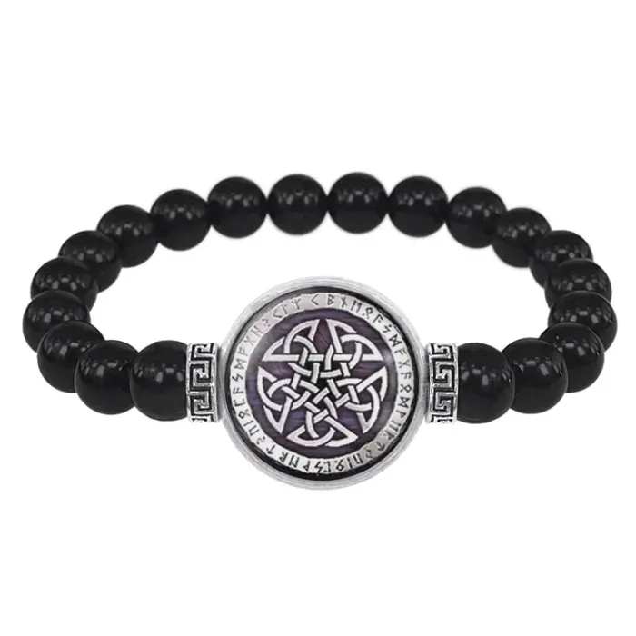 Стрейч-браслет с амулетом в виде кельтской пентаграммы. Материалы: чёрный агат, бижутерный сплав, стекло.