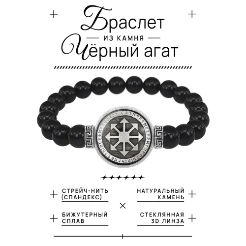 Стрейч-браслет из натурального чёрного агата с центральным элементом, украшенным изображением под выпуклой стеклянной линзой.