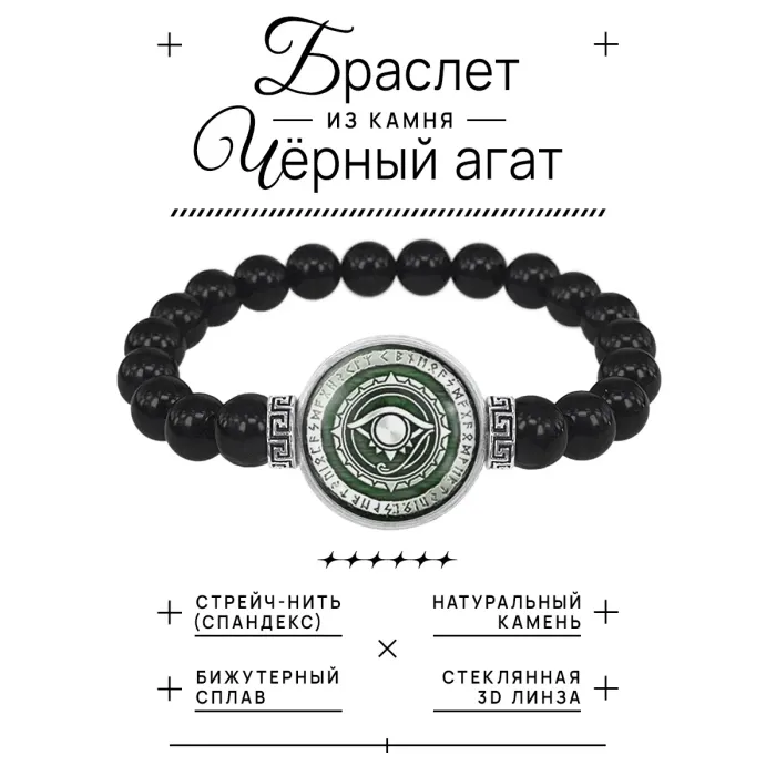 Материал и изготовление: Бусины из черного агата диаметром 8 мм, центральный элемент из бижутерного сплава с покрытием под серебро, изображение амулета под выпуклой стеклянной линзой диаметром 20 мм.