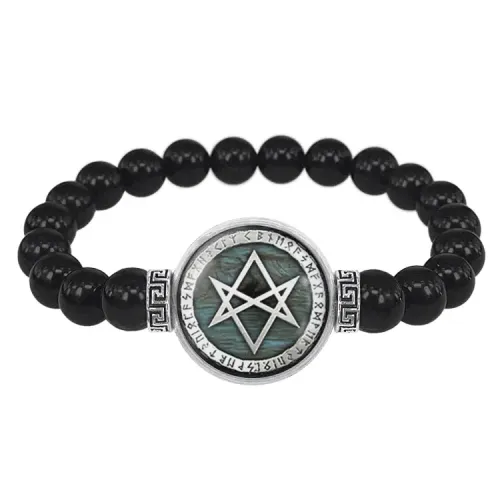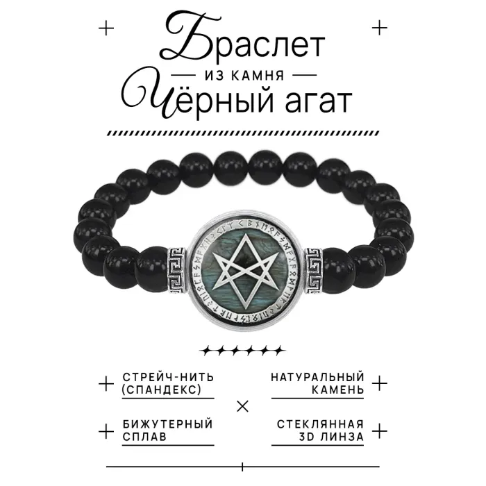 Стрейч-браслет из бусин чёрного агата с кулоном в виде уникурсальной гексаграммы под стеклянной линзой.