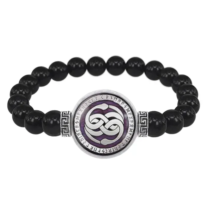 Стрейч-браслет из бусин чёрного агата с центральным элементом в виде амулета Уроборос под выпуклой стеклянной линзой.