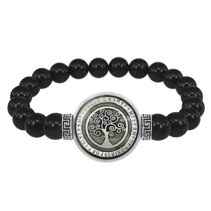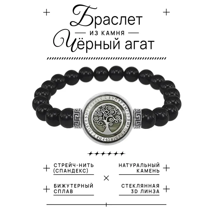 Стрейч-браслет с амулетом Дерево жизни из бусин черного агата и бижутерного сплава.