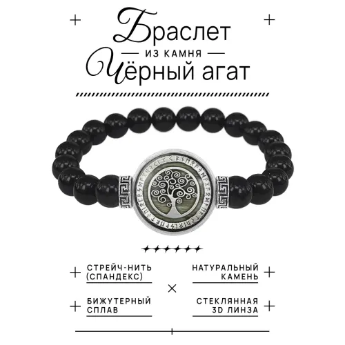 Материал и изготовление: Бусины из черного агата диаметром 8 мм, бижутерный сплав с покрытием под серебро, стеклянная линза. Изображение амулета диаметром 20 мм расположено под выпуклой стеклянной линзой.