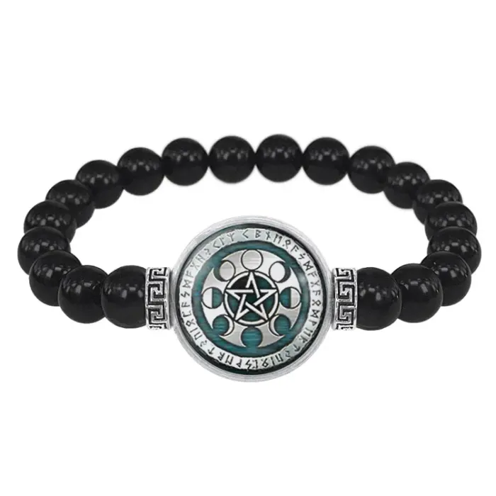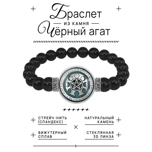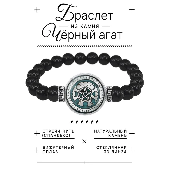 Стрейч-браслет из бусин чёрного агата с декоративным элементом «Фазы Луны» под выпуклой стеклянной линзой.