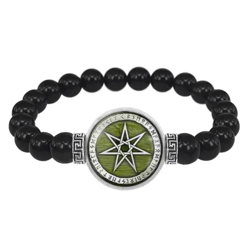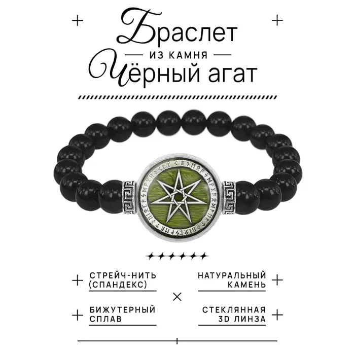 Стрейч-браслет из натурального чёрного агата с декоративным элементом «Звезда магов» под стеклянной линзой.