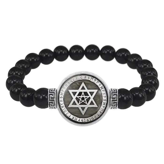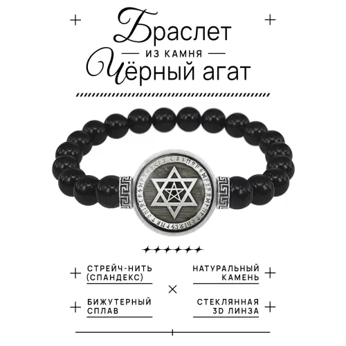 Браслет из черного агата Звезда Давида и пентаграмма BSBA-176