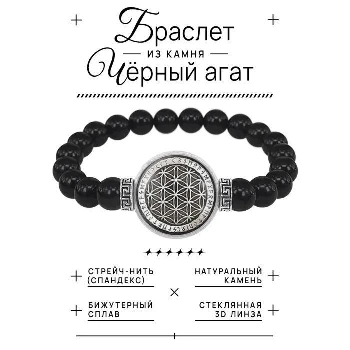 Стрейч-браслет из бусин чёрного агата с центральным элементом в виде символа Цветок жизни под стеклянной линзой.