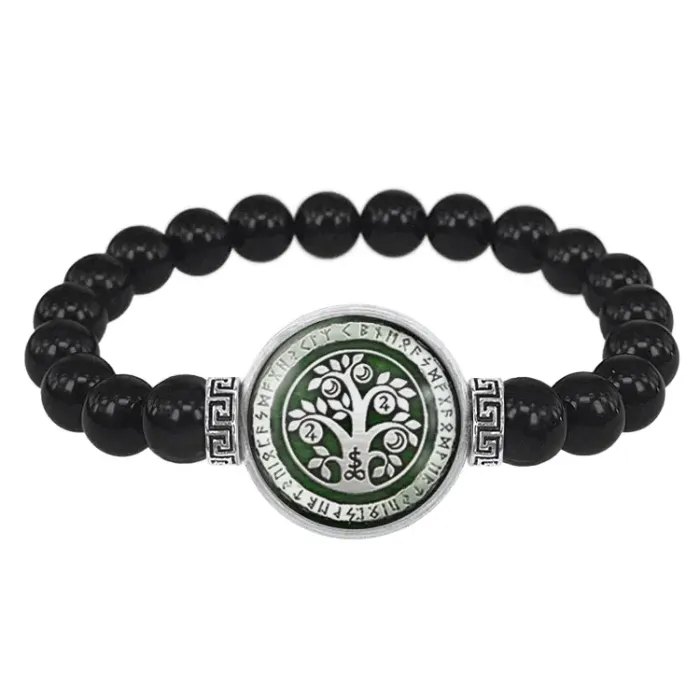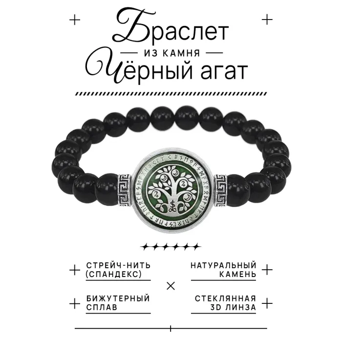 Стрейч-браслет из бусин чёрного агата с декоративным элементом под стеклянной линзой.