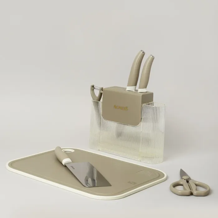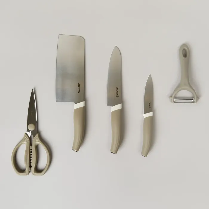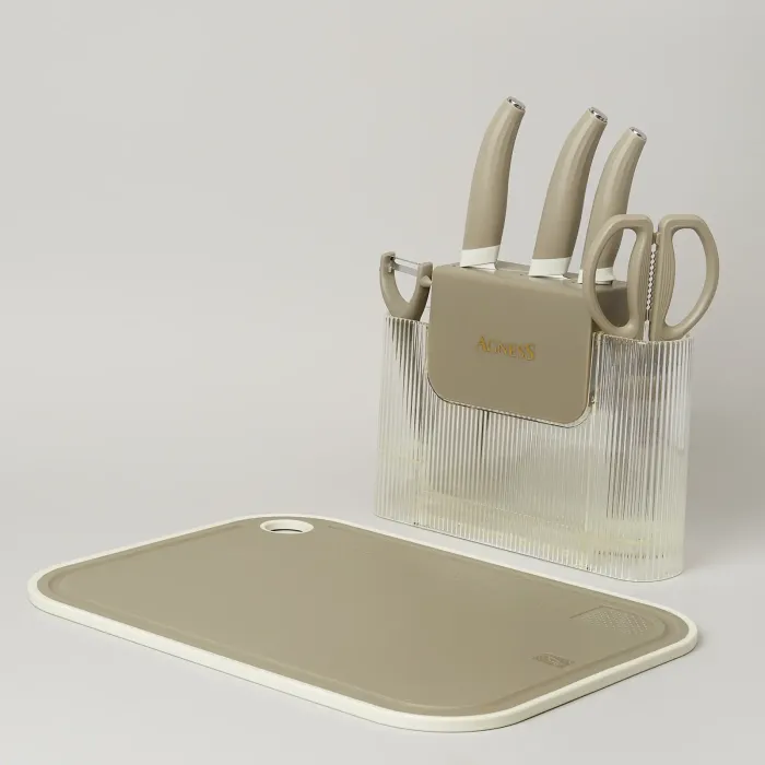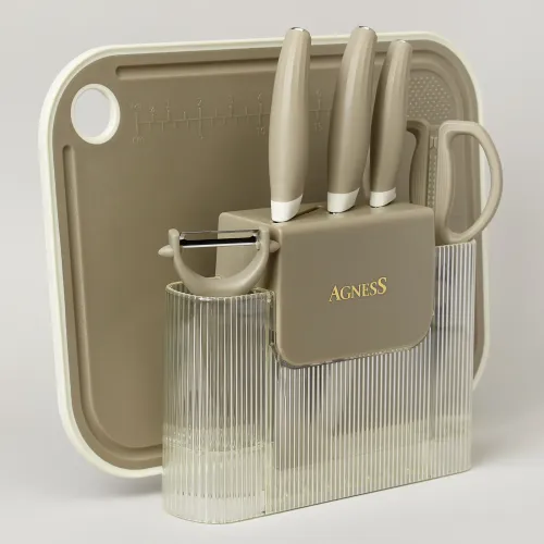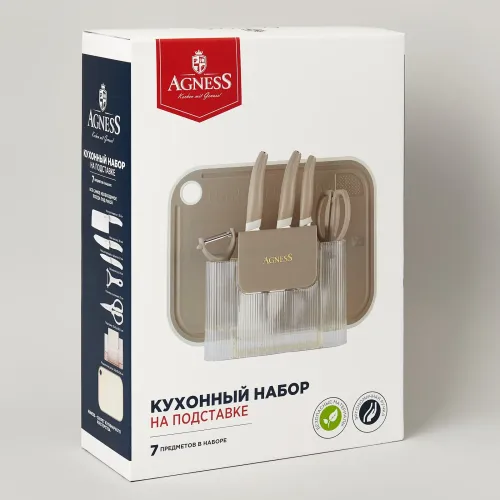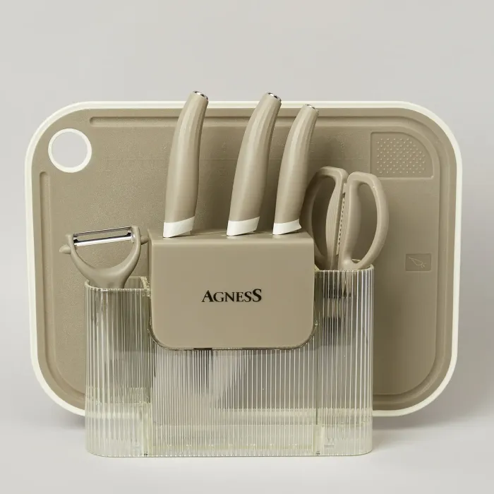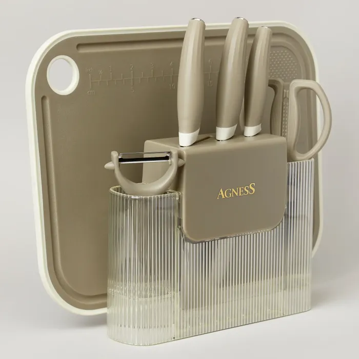 Набор кухонных предметов Agness включает семь основных инструментов для приготовления пищи: ножи, ножницы, разделочную доску и тёрку. Комплект предназначен для выполнения различных кухонных задач, от нарезки до чистки овощей. Ключевыми преимуществами являются использование высокоуглеродистой стали для лезвий и эргономичных ручек.