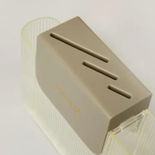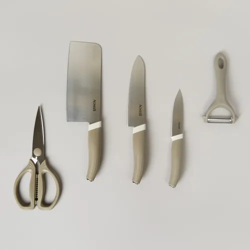 Для поддержания остроты лезвий рекомендуется использовать соответствующие методы заточки. Подставка позволяет компактно разместить набор на кухонной столешнице или в шкафу. Универсальный серый цвет и лаконичный дизайн предметов сочетаются с различными стилями кухонного интерьера.