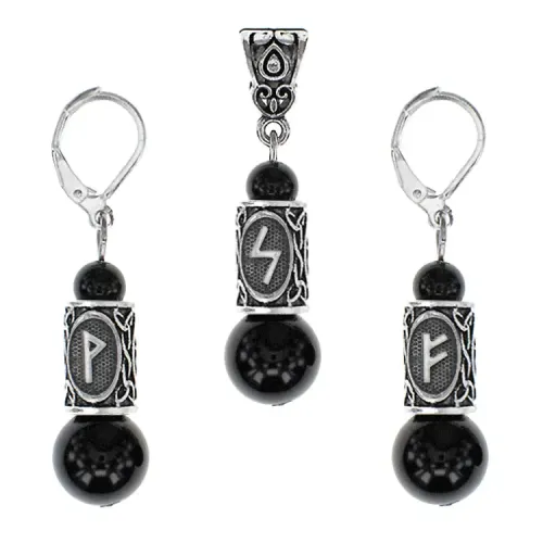 Рунический комплект, включающий серьги и кулон из натурального чёрного агата и бижутерного сплава.