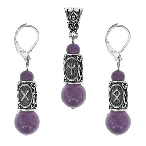 Рунический комплект включает серьги и кулон из натурального аметиста с символами рун.