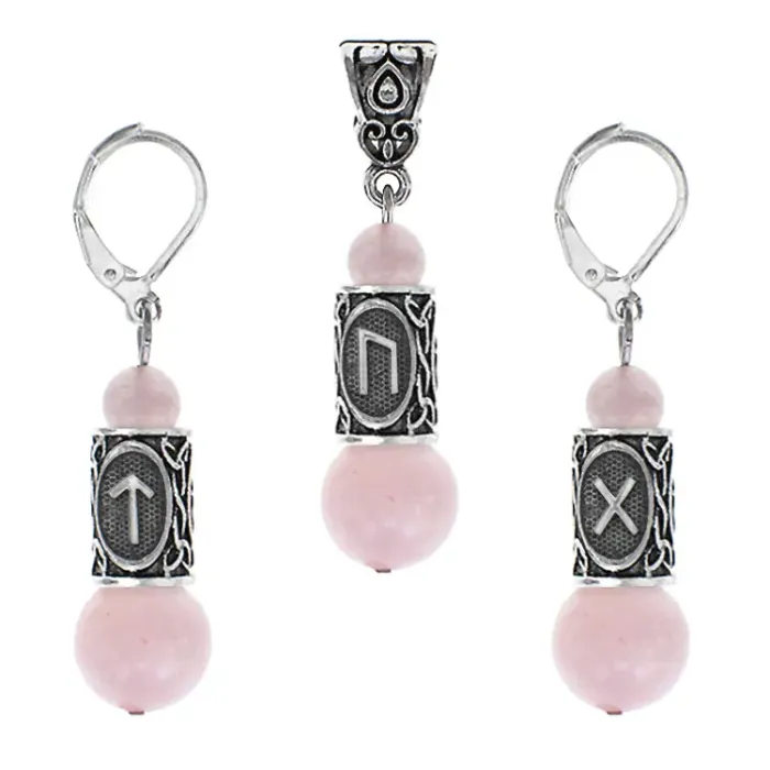Сувенирный комплект из натурального камня, включающий серьги и кулон с руническими символами.