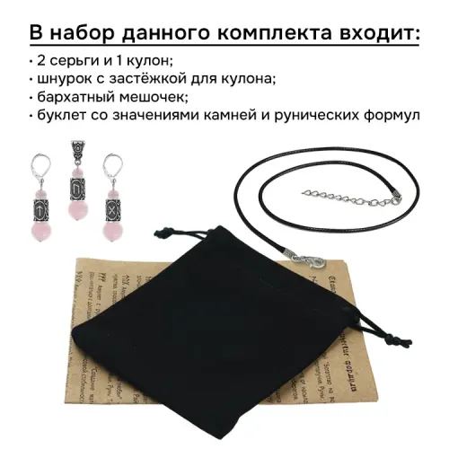 Размеры и комплектация: В комплект входят бусины диаметром 6 и 10 мм. Комплектация включает серьги, кулон, шнурок, бархатный мешочек для хранения, буклет, этикетку и полипропиленовый пакет с подвесом.