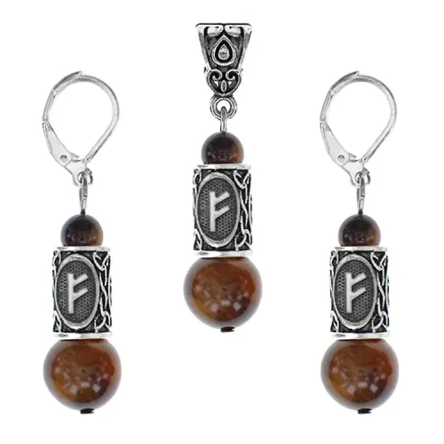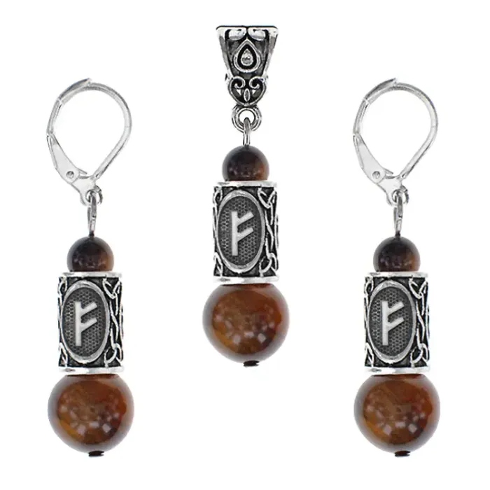 Рунический комплект «Материальное благополучие» включает серьги и кулон из натурального камня тигровый глаз с руническими символами.