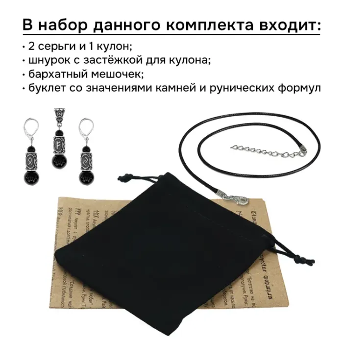 Рунический комплект «Приумножение собственности» включает серьги и кулон из натурального чёрного агата и бижутерного сплава.