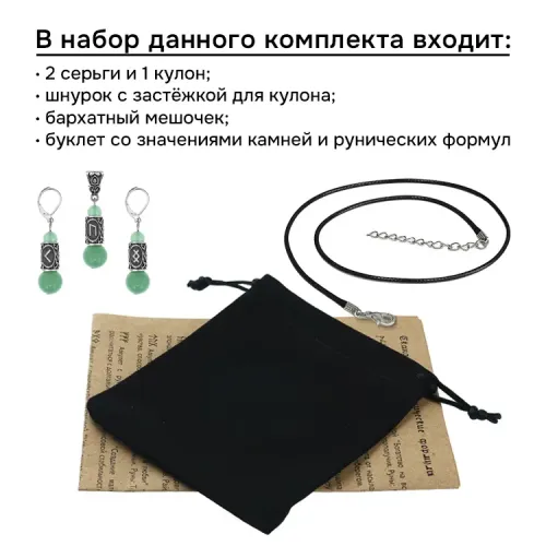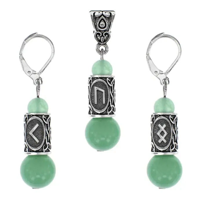 Рунический комплект для ношения, включающий серьги и кулон из натурального нефрита с руническими бусинами.