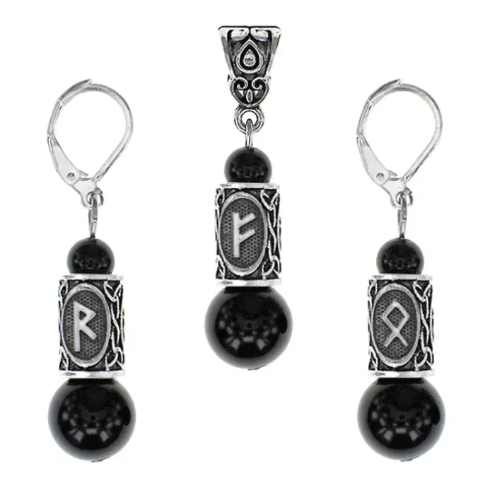 Рунический комплект «Стабильный доход» включает серьги и кулон из натурального черного агата с руническими символами.