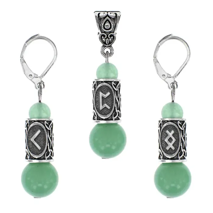 Рунический комплект для сувенира или аксессуара из натурального нефрита и бижутерного сплава.