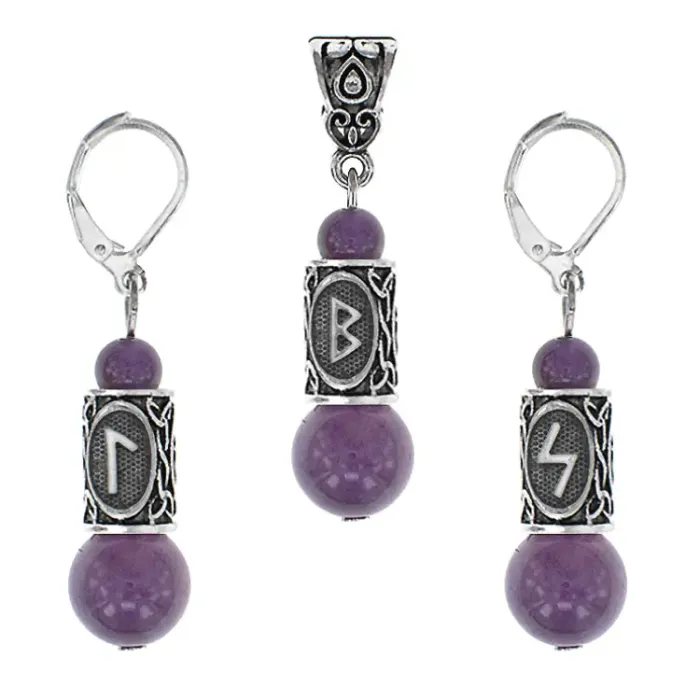 Рунический комплект для интерьерного декора, состоящий из серьг и кулона. Изготовлен из натурального аметиста и бижутерного сплава, включает рунические бусины.