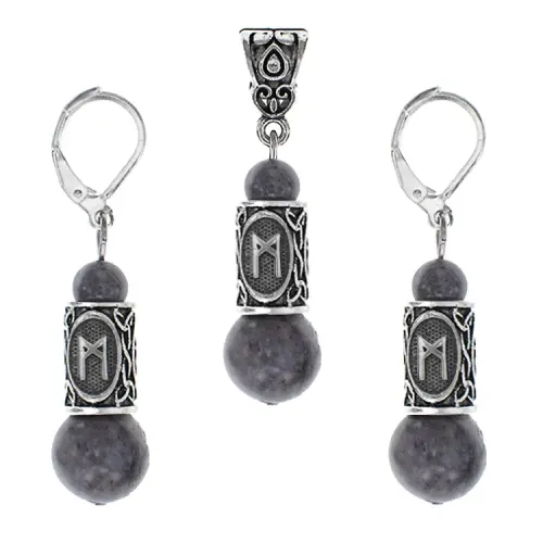Рунический комплект из натурального камня лабрадор, включающий серьги и кулон.