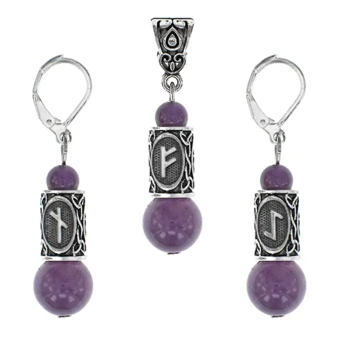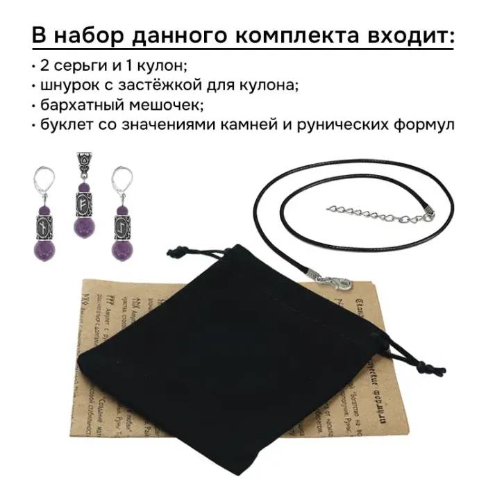 Рунический комплект, включающий серьги и кулон из натурального аметиста и бижутерного сплава.